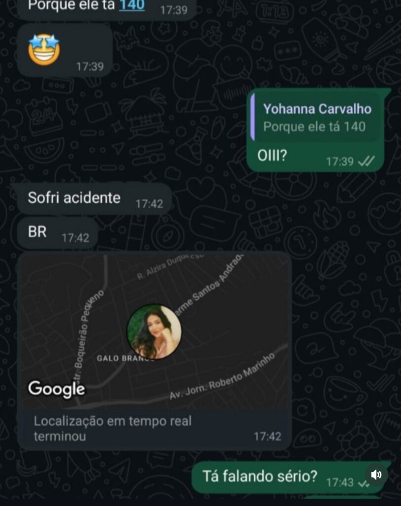 Gomes, de 25 anos, enviou uma mensagem para um amigo minutos antes de sofrer um grave acidente na BR-101, altura do Boa Vista, em São Gonçalo, enquanto voltava para casa em uma moto de aplicativo. No texto, ela relatou que o motociclista estava acima da velocidade permitida na rodovia. O acidente aconteceu na tarde de segunda-feira (24). De acordo com o registro do aplicativo de transporte, ao qual o ENFOCO teve acesso, Yohanna solicitou a viagem às 17h19, na Rua XV de Novembro, no Centro de Niterói. Pouco depois, já na moto, ela enviou uma mensagem para o amigo e demonstrou preocupação com a condução do piloto. “Deixa eu só sair da BR. Estou quase entrando aqui no shopping da BR [101] porque ele está a 140” , escreveu Yohanna às