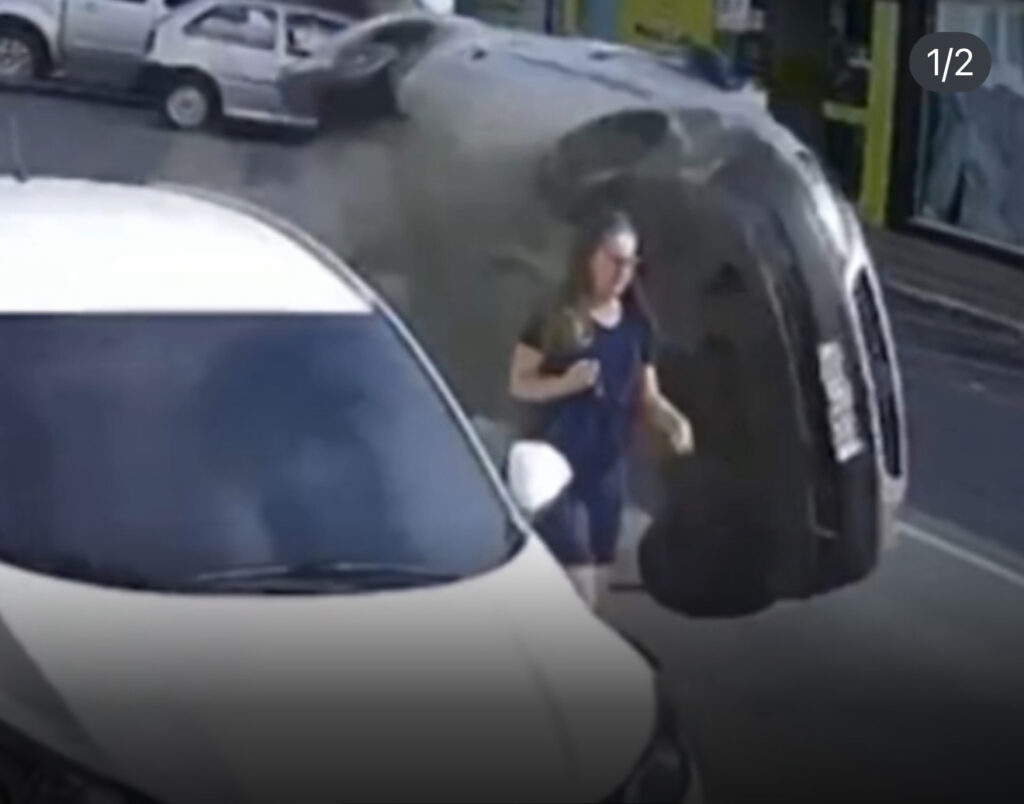 Um acidente envolvendo dois veículos assustou moradores de Braço do Norte, no Sul de Santa Catarina. Uma mulher que caminhava pela via escapou por pouco de ser atingida após um carro colidir contra um veículo estacionado e capotar. O momento foi registrado em vídeo e viralizou nas redes sociais.