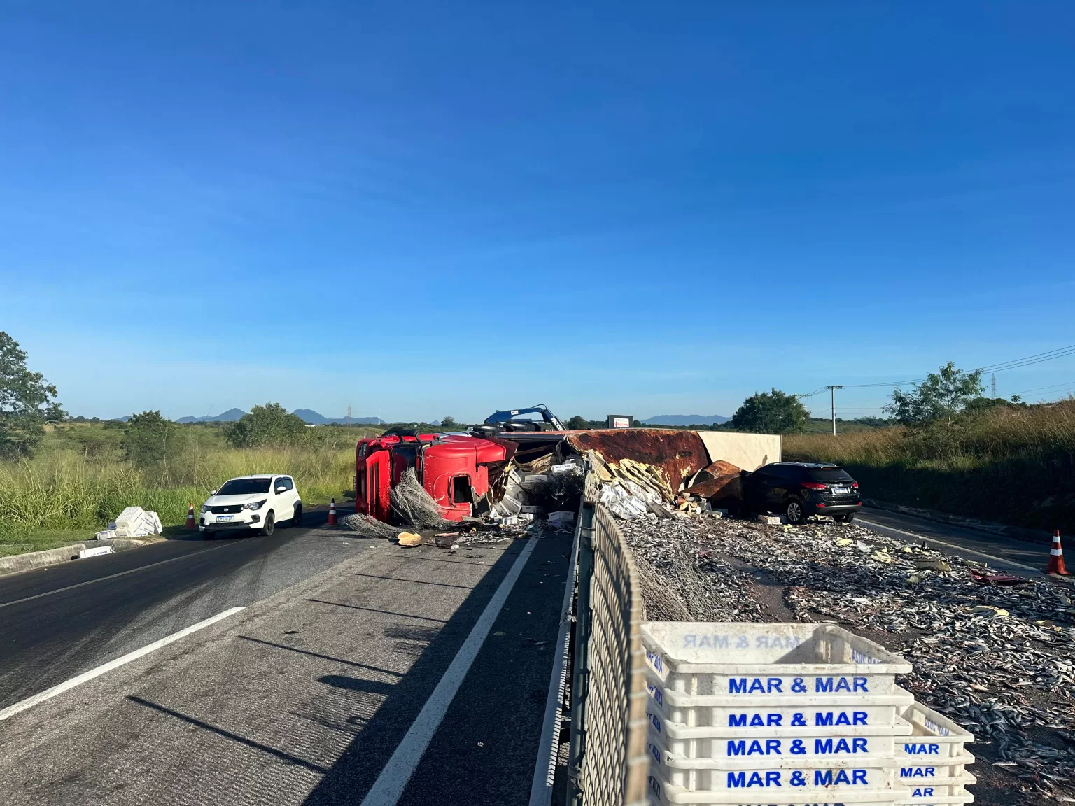 Caminhão com carga de peixe tomba na RJ-124, e colide com carro