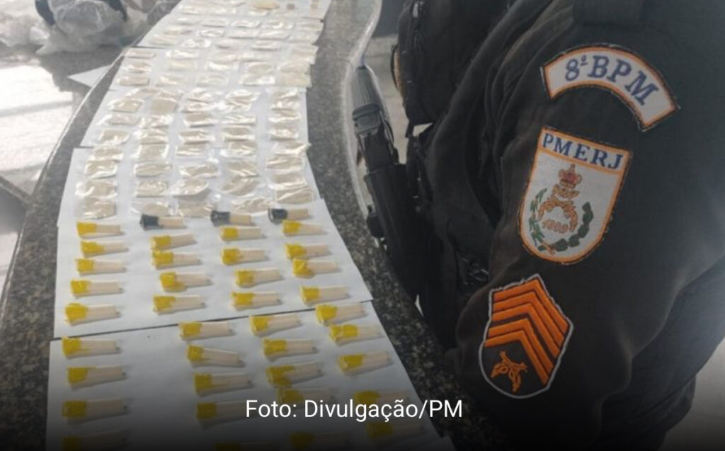 De acordo com a PM, inicialmente, foram à Avenida Adão Pereira Nunes, na comunidade da Tira Gosto. Com a chegada da polícia, houve uma intensa correria de indivíduos, impossibilitando a captura de qualquer suspeito. Em uma revista no terreno, os policiais localizaram 46 pinos e 108 papelotes de cocaína, 28 buchas de maconha e 11 papelotes de haxixe.
